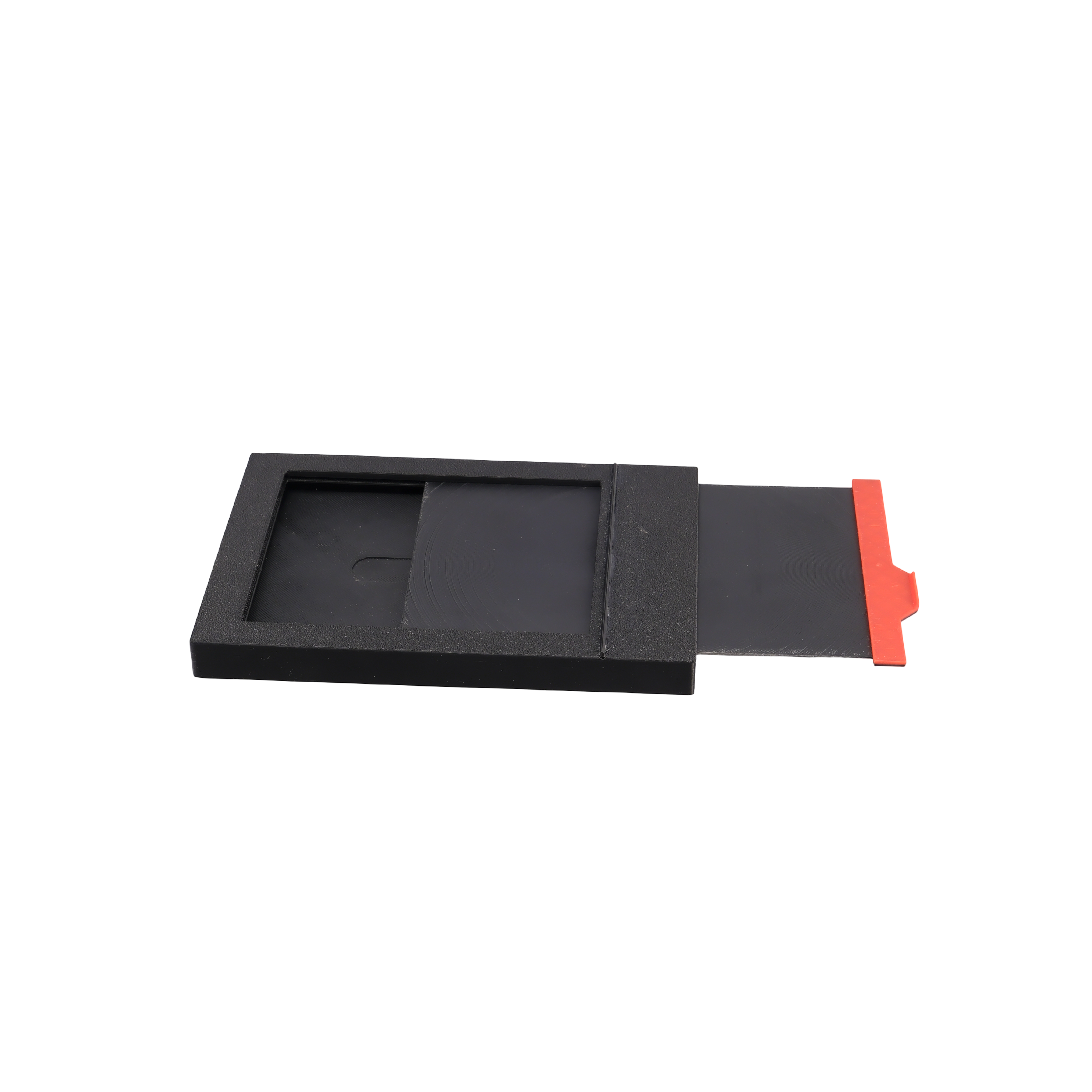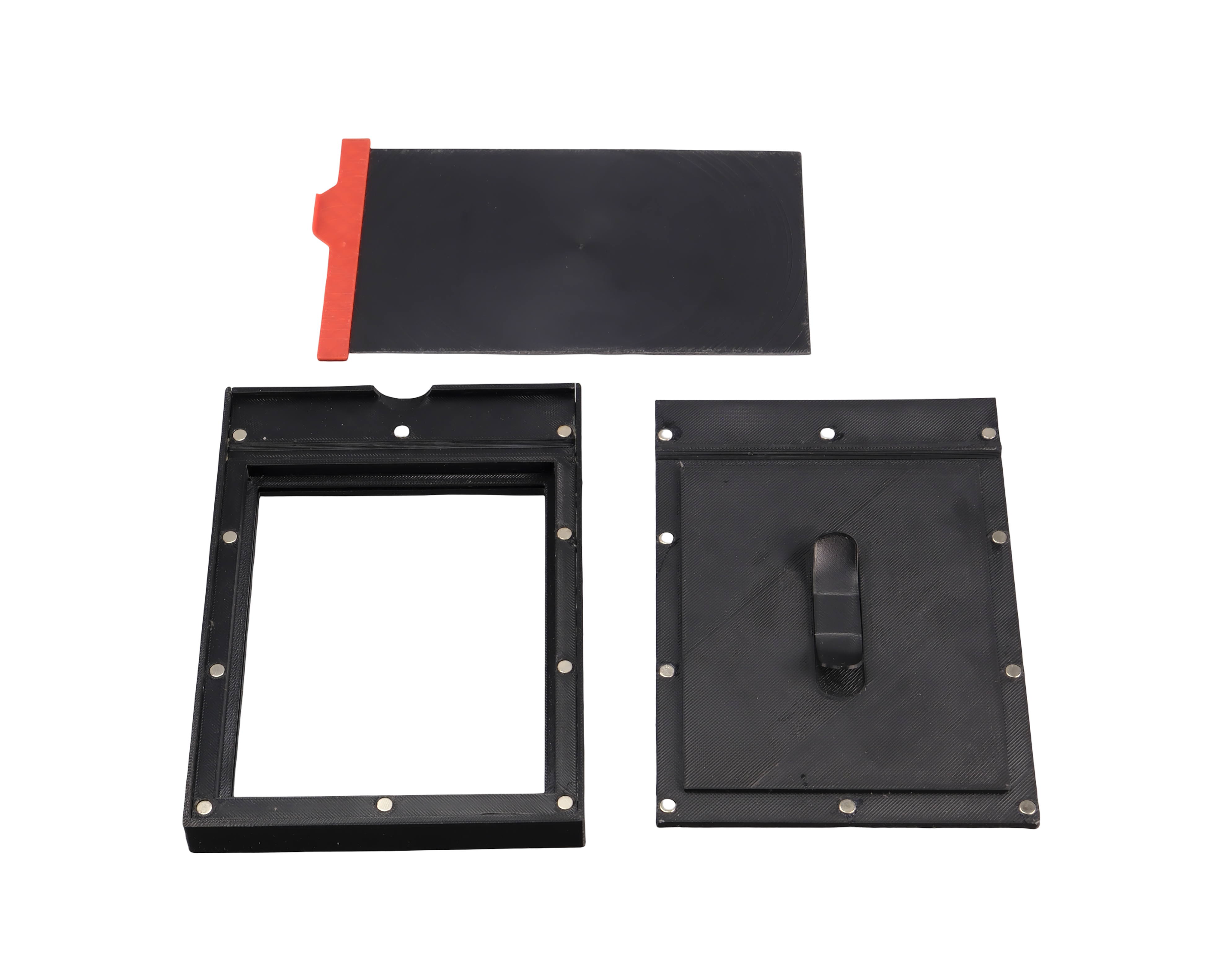El cierre del soporte es magnético para facilitar la carga y descarga de las placas fotográficas y se puede variar el grosor de la placa ya que tiene un muelle que las mantiene bien sujetas en el plano focal